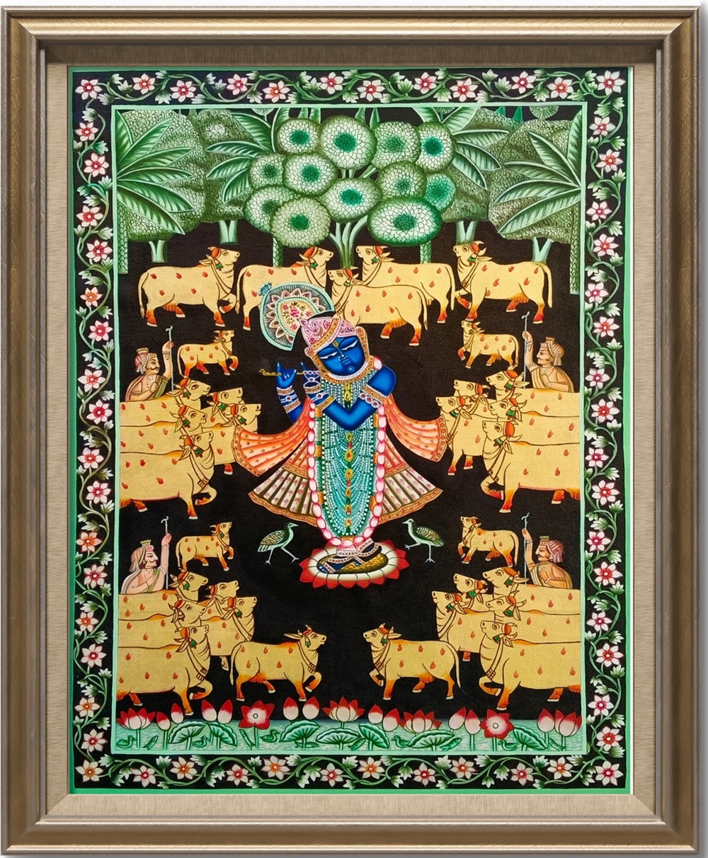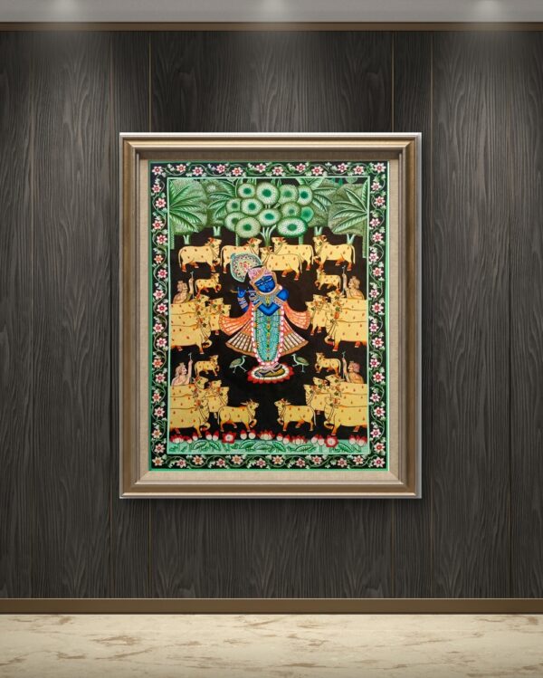 Bring home this enchanting piece of Pichwai art and let it transform your space into a haven of peace and beauty. Order now to make Flute of Eternal Bliss a cherished part of your collection and experience the serenity of Krishna’s divine melody every day.